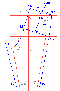 Draft the back pattern according to the picture along points 16 - 14 - 11 - 18 - 19 - 5 - 19 - 15 - 17. Find the point midway between points 16 and 17 and draw a dart there. The dart is 2 cm wide and 8 cm deep. The dart apex is on a line which forms a straight angle against the hip line.